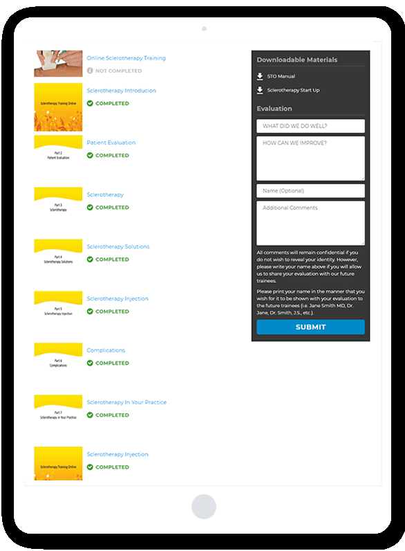 This ONLINE ONLY sclerotherapy injection certification training course is designed for medical practitioners who are already proficient in IV insertion. After the online sclerotherapy class, you will receive a certificate of training.